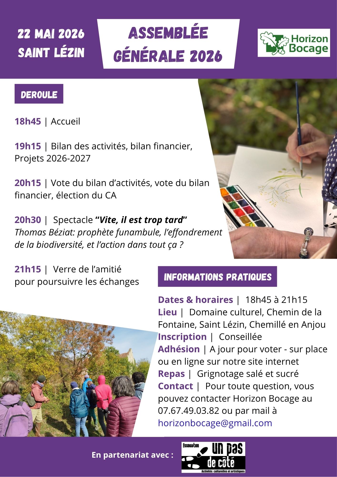 Vous êtes cordialement inviter à notre assemblée générale 2026 qui aura lieu le vendredi 22 mai à Saint Lézin (au Chapiteau d’un Pas de Côté) à partir de 18h45. Le spectacle « Vite, il est trop tard » est proposé à la fin de l’AG. Au plaisir de vous y voir nombreuses et nombreux.